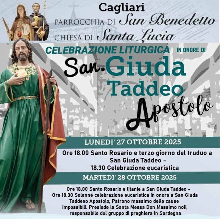 – Ore 18:30: Solenne Celebrazione Eucaristica in onore di San Giuda Taddeo, presiede la Santa Messa, Don Massimo Noli responsabile del gruppo di preghiera in Sardegna, seguita da un incontro di preghiera. Sarà un momento di comunione e condivisione, uniti nella fede e nella gratitudine.