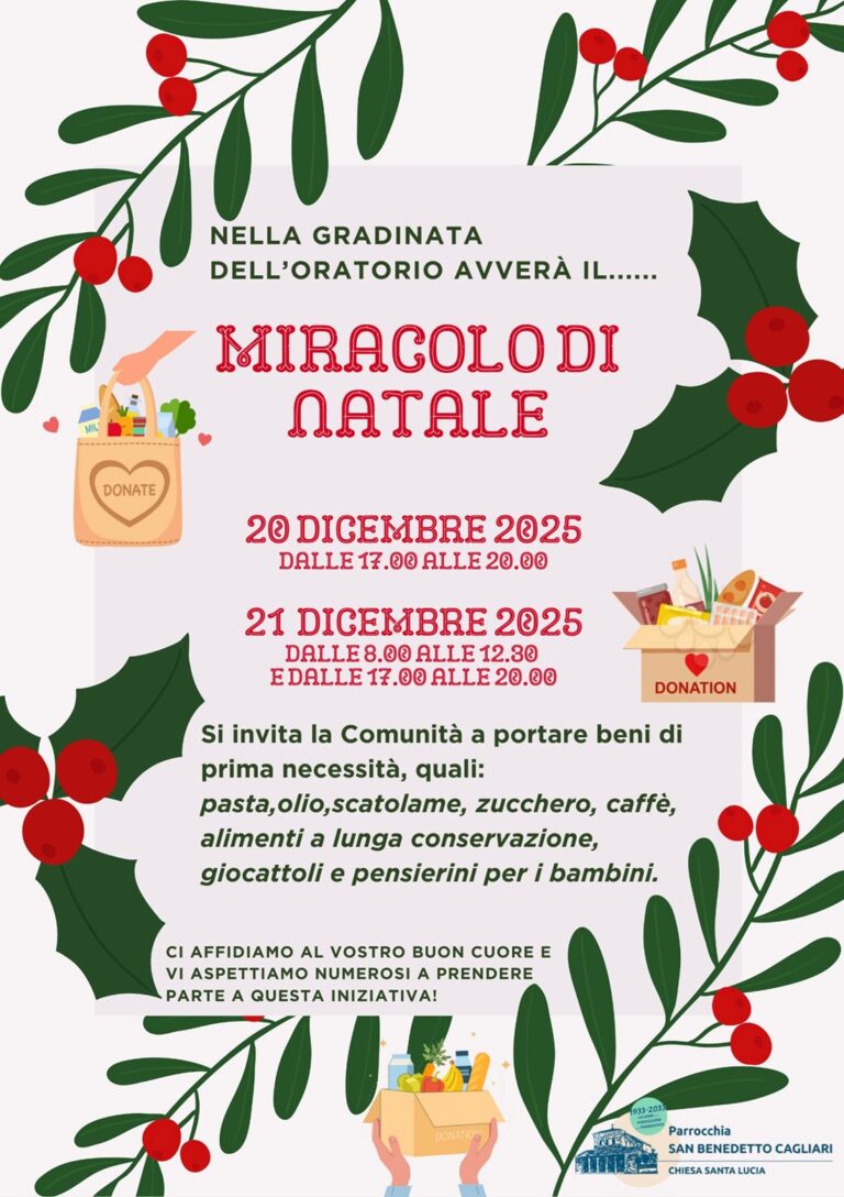 La Parrocchia di San Benedetto in Cagliari invita calorosamente la comunità a partecipare a un’iniziativa speciale: il “Miracolo di Natale“. Nei giorni 20 e 21 dicembre 2025, l’oratorio della parrocchia si trasformerà in un luogo di solidarietà e condivisione.